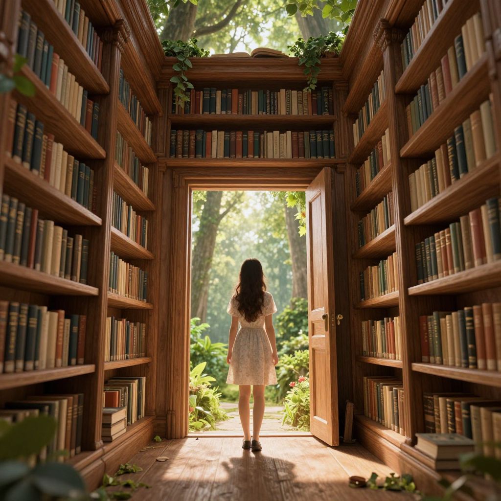 In a whimsical digital art rendering, a young woman stands at the threshold of a magical library, where towering wooden shelves filled with books frame an ethereal doorway leading into a lush, sunlit forest, embodying the enchanting concept of stepping through open pages into alternate worlds.