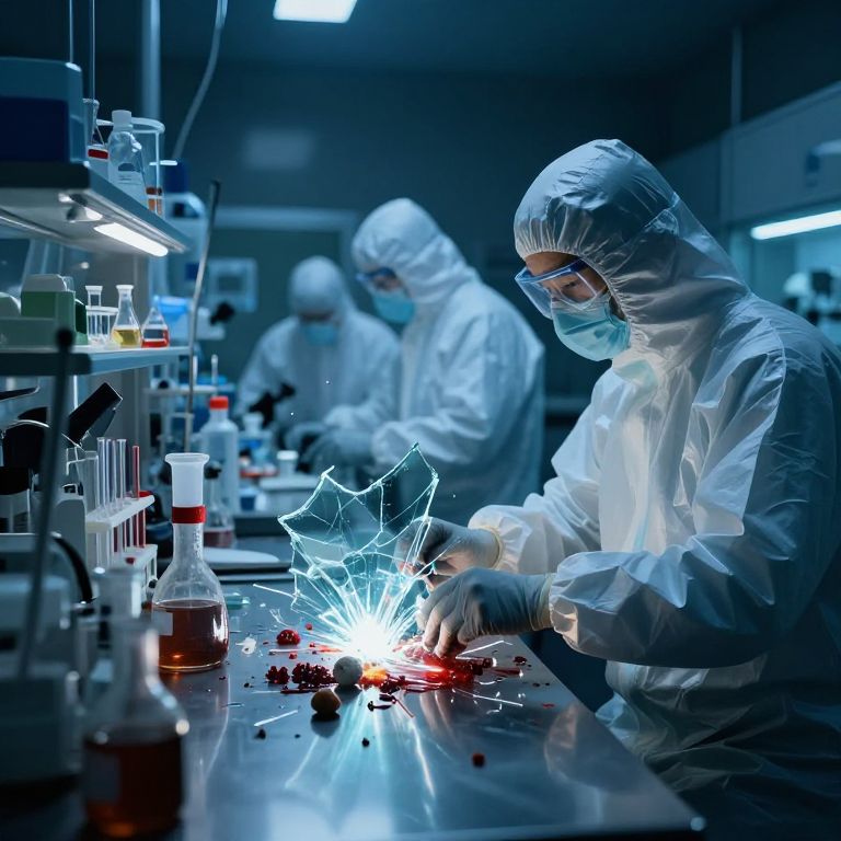 Contamination inside a high-tech laboratory, broken glass and spilled chemicals glowing ominously, scientists in hazmat suits working frantically, sterile metallic surfaces contrasted with hazardous bio-contaminants, moody shadows and intense focus on danger.