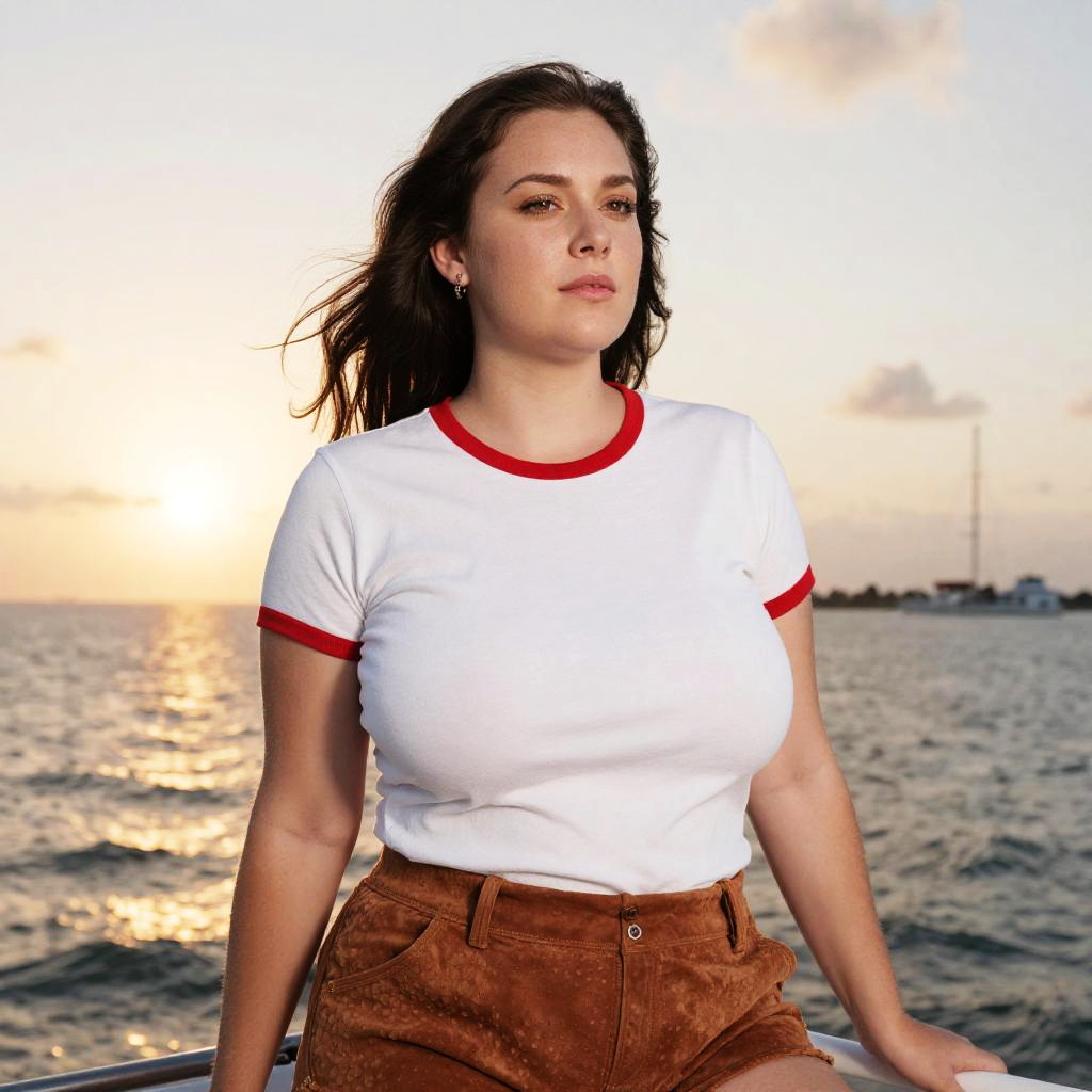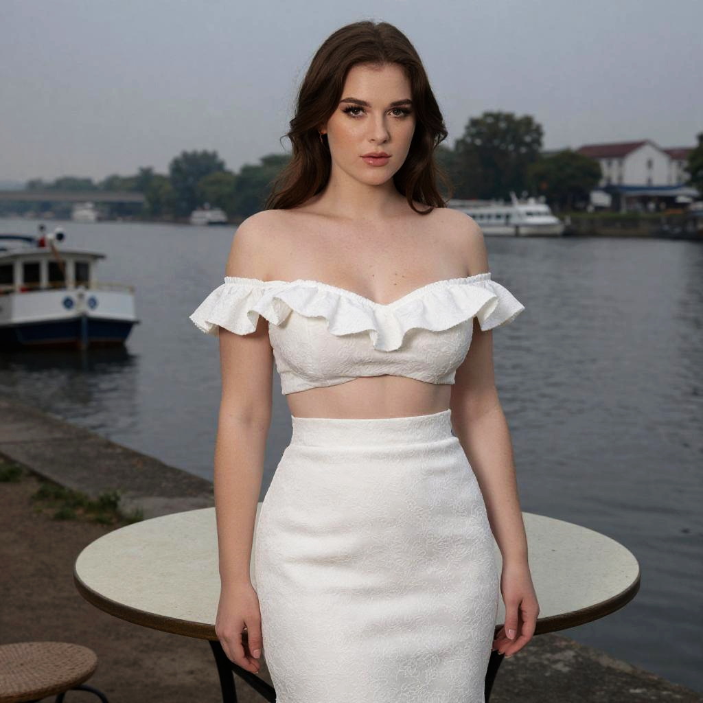 A Willowy woman, in a contemporary casual off-shoulder floral top with yellow splashes and short ruffled sleeves, paired with high-waist black trousers, strolling along a fishing pier with a seafood market, embodying the vibrant visual style of Audrey Flack. Sexy. Pretty face and beаutiful eyes. Big breasts