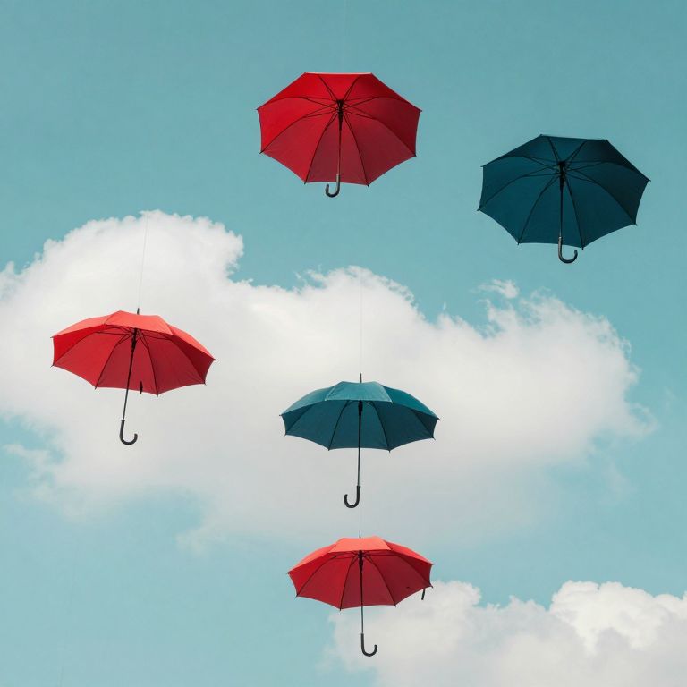 Upside-down umbrellas of vibrant red and deep teal float serenely among fluffy white clouds, suspended by delicate threads against a tranquil turquoise sky.