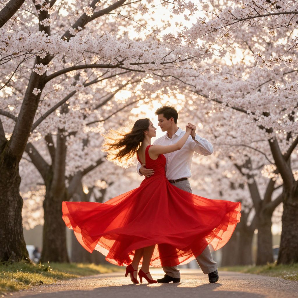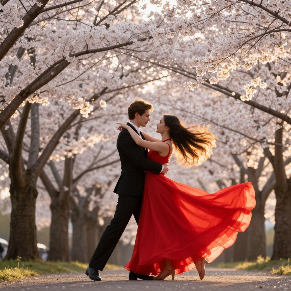 Romantic couple gracefully dancing under a canopy of blooming cherry blossoms, illuminated by warm golden light, as the woman's flowing red gown billows elegantly in the breeze.