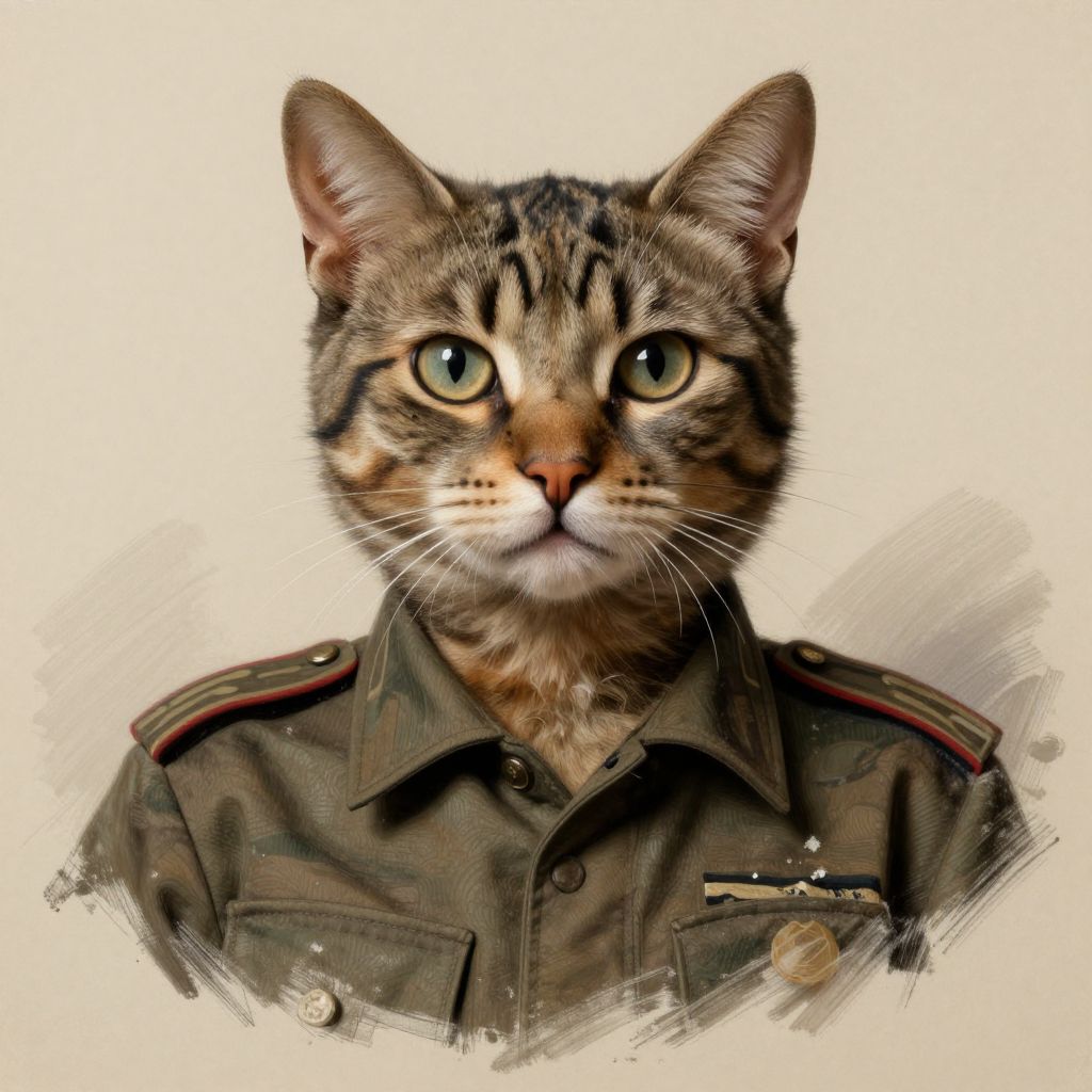 Photorealistic digital artwork of a tabby cat with green eyes, wearing a dark green military-style uniform with red trim and a single buttoned pocket. The cat's fur is detailed with brown and black stripes, and its ears are alert. The background is a textured, off-white color, adding contrast to the cat's and uniform's dark tones. The cat's expression is serious and focused, giving it a dignified appearance. The uniform includes a small brass button and a subtle insignia on the left side. The overall image has a crisp, polished look.