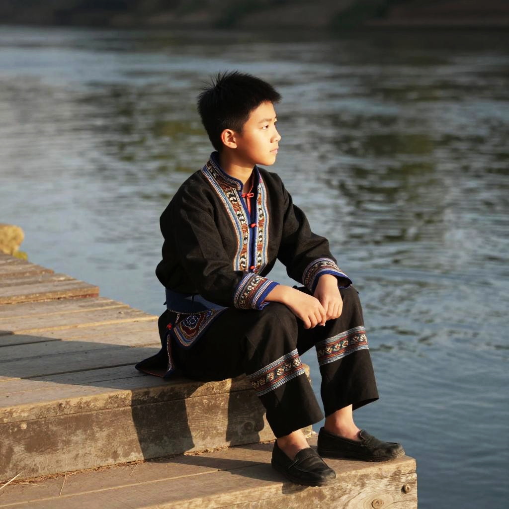 Foreign boy sitting on wooden steps beside a serene river, traditional cultural attire with intricate patterns, golden hour lighting, realistic texture details, peaceful and contemplative mood