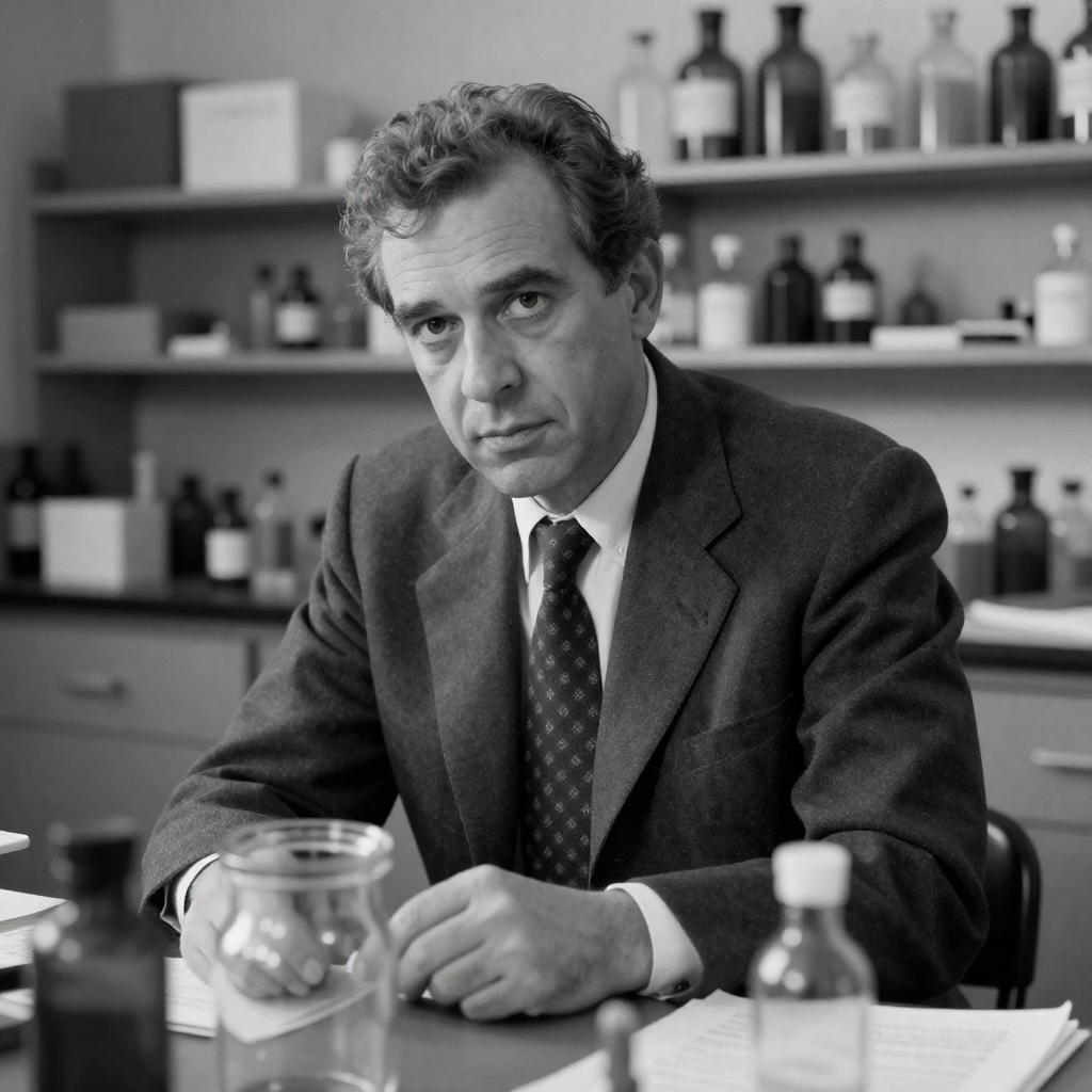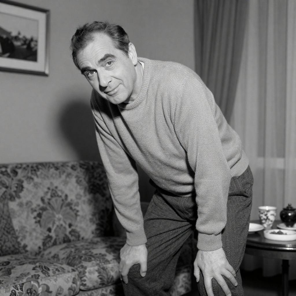 Black-and-white photograph of a middle-aged man with short hair, wearing a loose sweater and patterned pants, leaning forward with a slight smile in a vintage, floral-patterned living room. Background includes a framed picture, curtains, and a small table with objects. The man's relaxed posture contrasts with the room's classic, slightly cluttered decor.