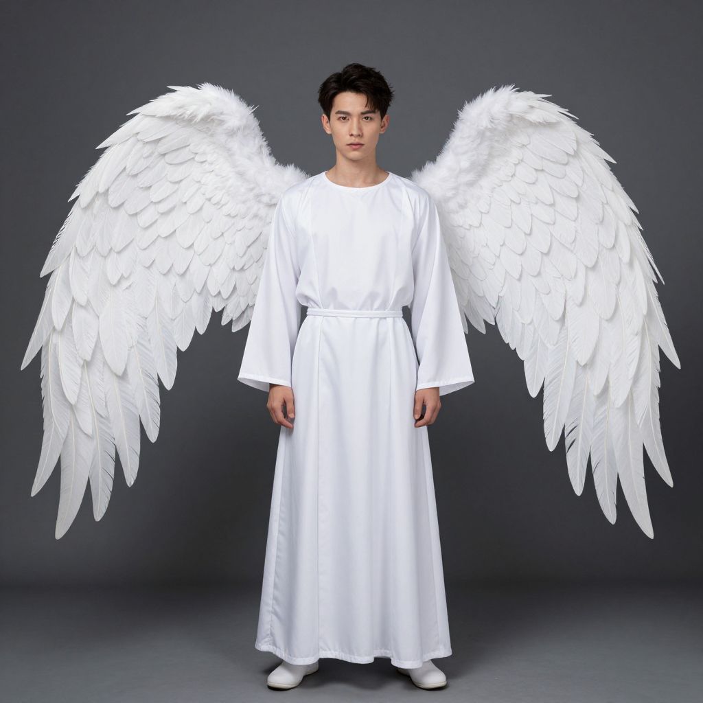 Archangel costume, wings, male focus, angel wings, 1boy, angel, robe, full body, standing, feathered wings