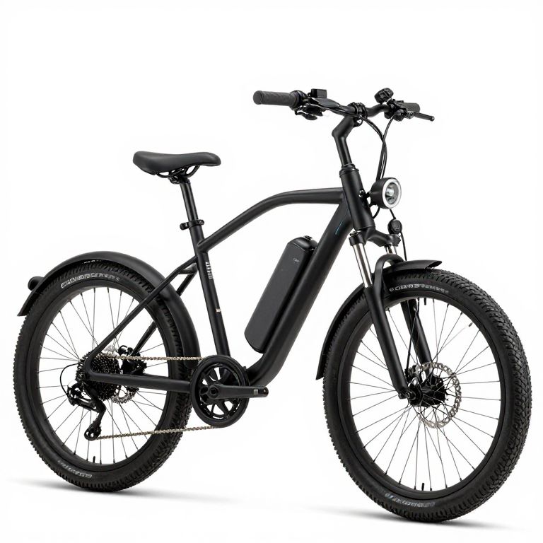Modern electric bicycle showcasing sleek black frame design with integrated battery pack, wide tires labeled \"COLDSTONE,\" and front headlight, positioned upright with kickstand engaged against a clean white background.