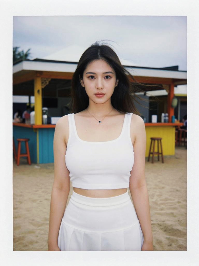 A slim woman in a trendy black crop top and a blue-grey tweed pencil skirt stands at a beach bar with a seafood grill, captured in a medium format film style. Sexy. Pretty face and beаutiful eyes. Big breasts
