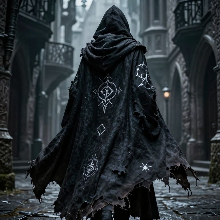 DND cloak art showcasing a rogue character wearing a tattered, shadowy cloak adorned with silver mystical symbols, blending into the shadows of a medieval city alley, dramatic lighting highlights the fabric folds and mystical details, fantasy art style.