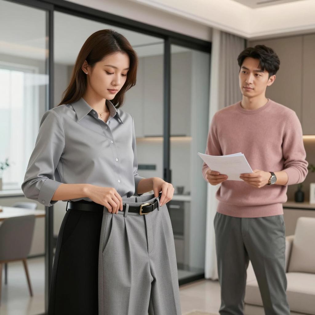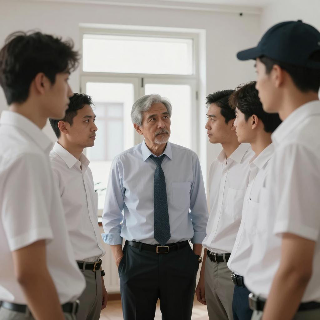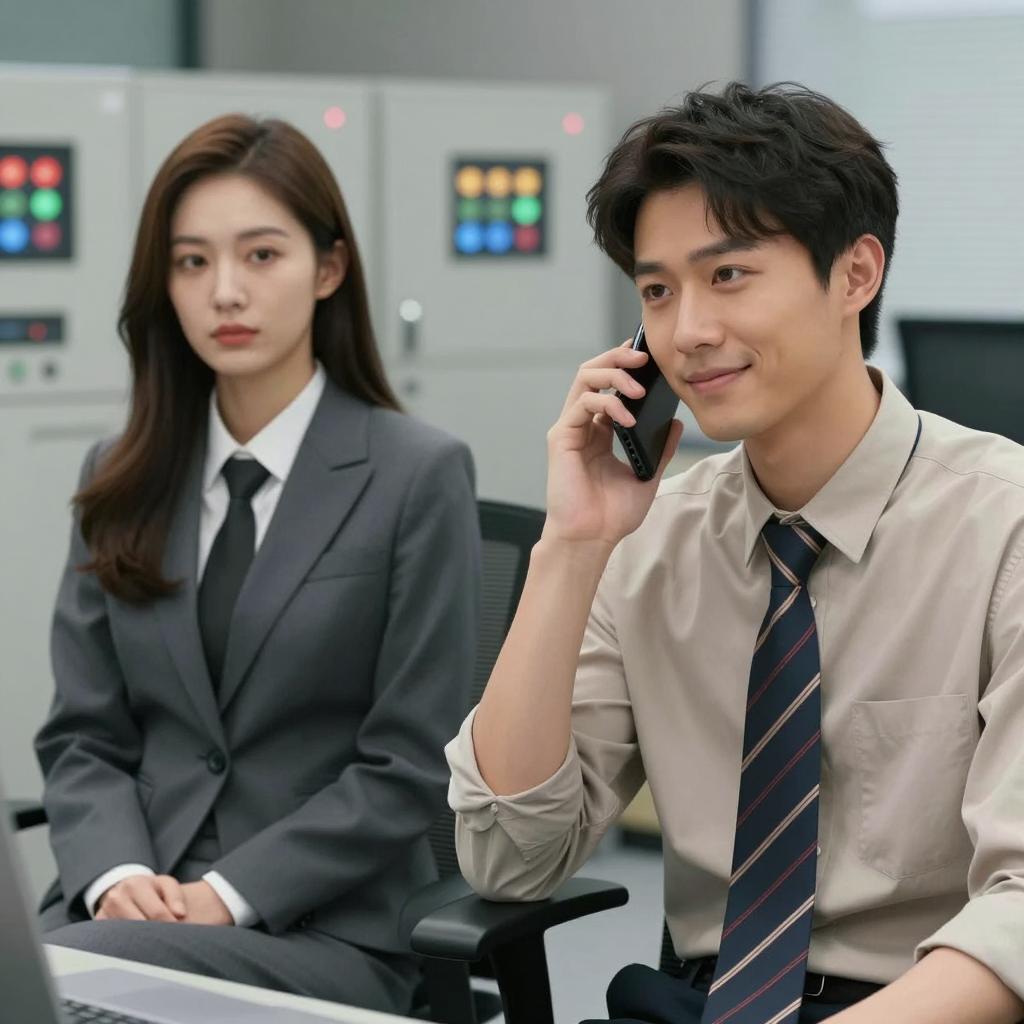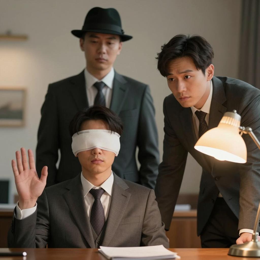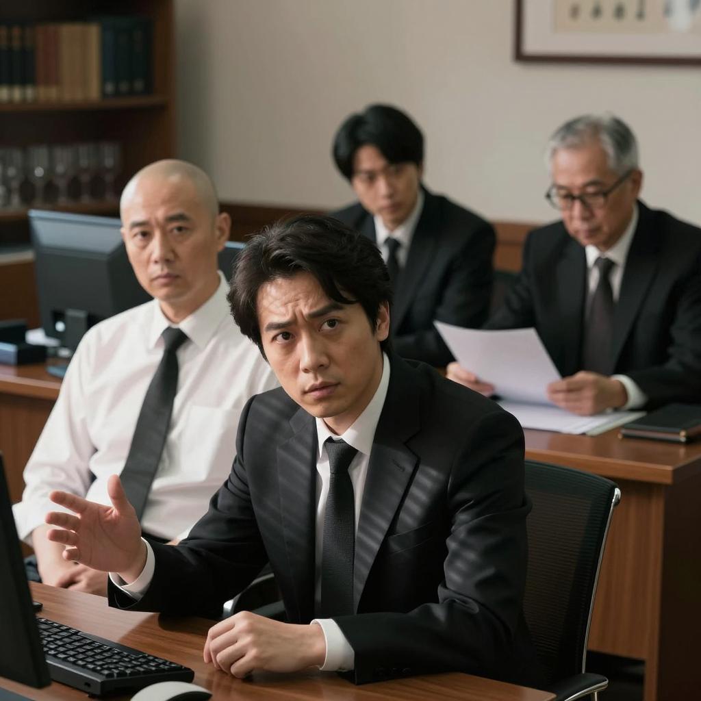 Three Asian office workers in a modern workspace. Two men are seated at a desk; one wears a light blue shirt and has short hair, the other wears a yellow shirt with a white vest and has raised his hand. A woman stands behind them with her arms crossed, dressed in a gray blazer over a white blouse. The desk features documents, a pen holder, and a computer. The background includes wooden bookshelves and a green decorative wall panel.