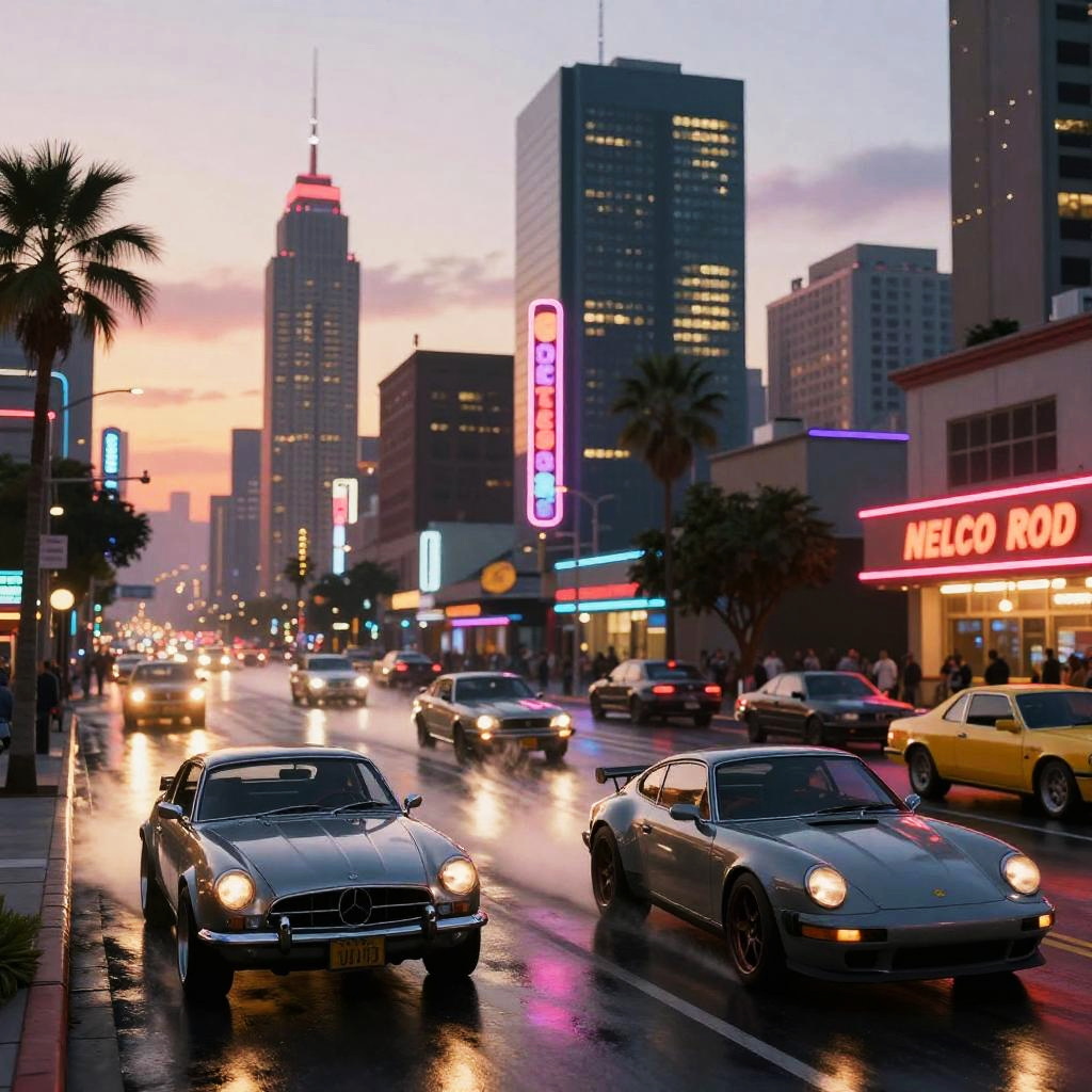 GTA picture featuring a detailed cityscape at sunset, vibrant neon lights reflecting on wet streets, classic sports cars racing, dynamic action scene in a cinematic style
