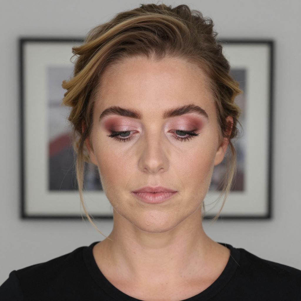 Close-up photograph of a woman with light brown hair in a loose bun, wearing a black top. She has pink eyeshadow, subtle makeup, and a neutral expression. Background is blurry with a framed picture. She is centered in the frame.