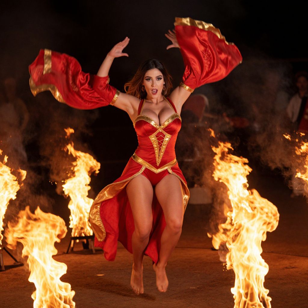 A dynamic fire dancer woman in a vibrant red and gold costume, with flowing silk sleeves and a fitted bodysuit, standing mid-leap in a darkened arena surrounded by rising flame props that swirl around her like living fire, her face lit by the glow of the flames, determined and expressive with focused intensity, realistic photography style. The woman has big tits and cute face