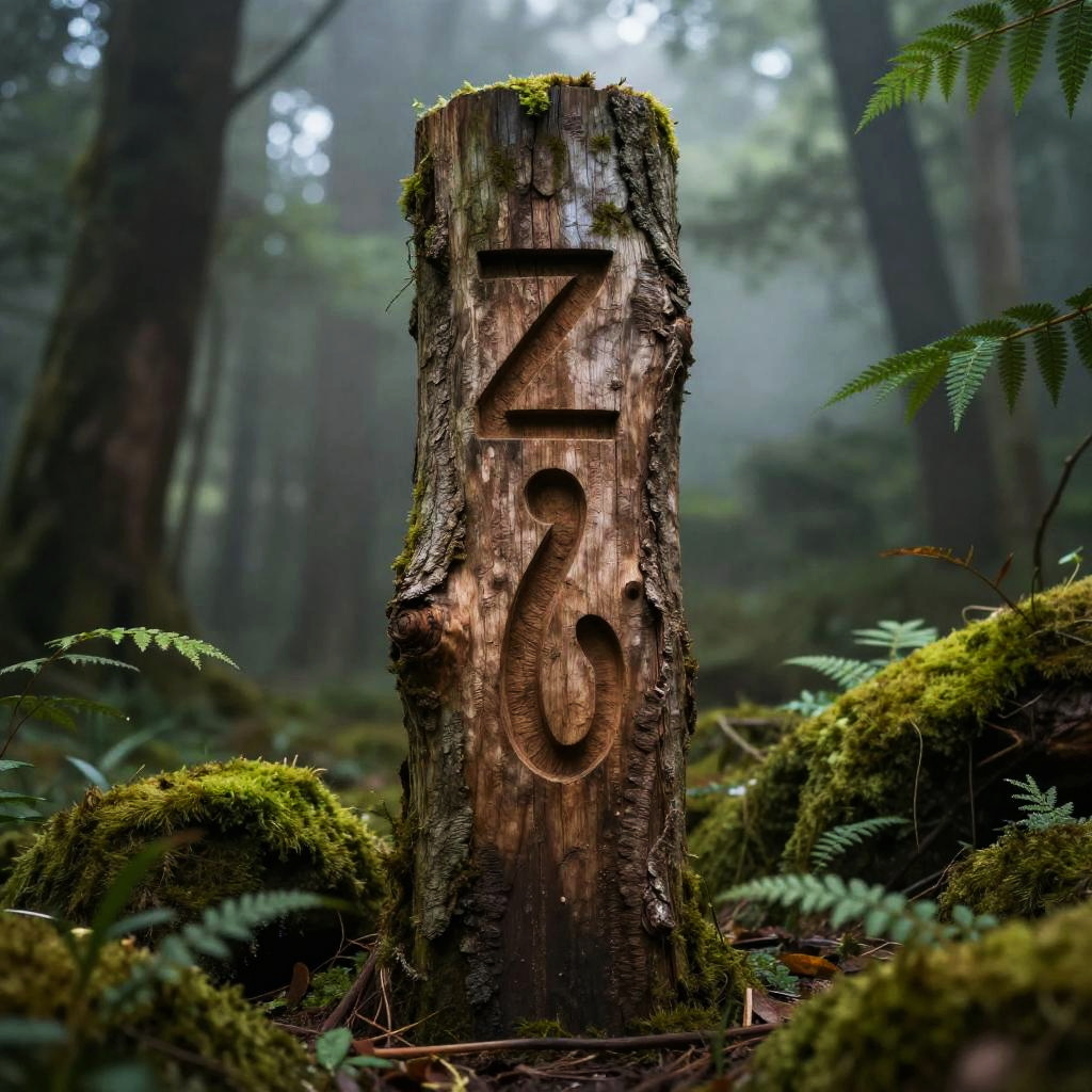 Zia symbol carved into a wooden totem, surrounded by green forest moss and soft mist, ethereal mood, fine details of bark and foliage, dynamic composition, atmospheric lighting, fantasy nature scene