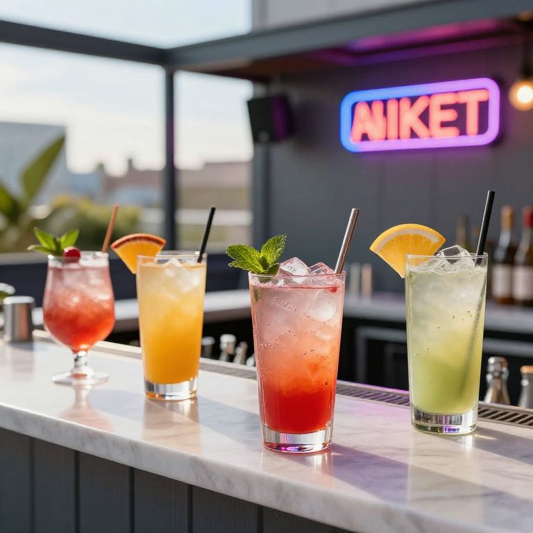 Drinks prompt: A vibrant, modern bar setup in a sunny rooftop lounge, featuring handcrafted cocktails with colorful ingredients, neon signs, and soft ambient lighting, emphasizing creativity and freshness in beverage culture.