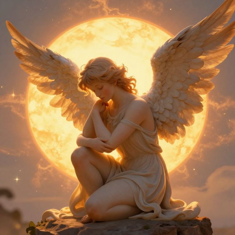 Digital artwork of a serene, winged angel with golden feathers kneeling before a glowing, radiant sun, praying with closed eyes.