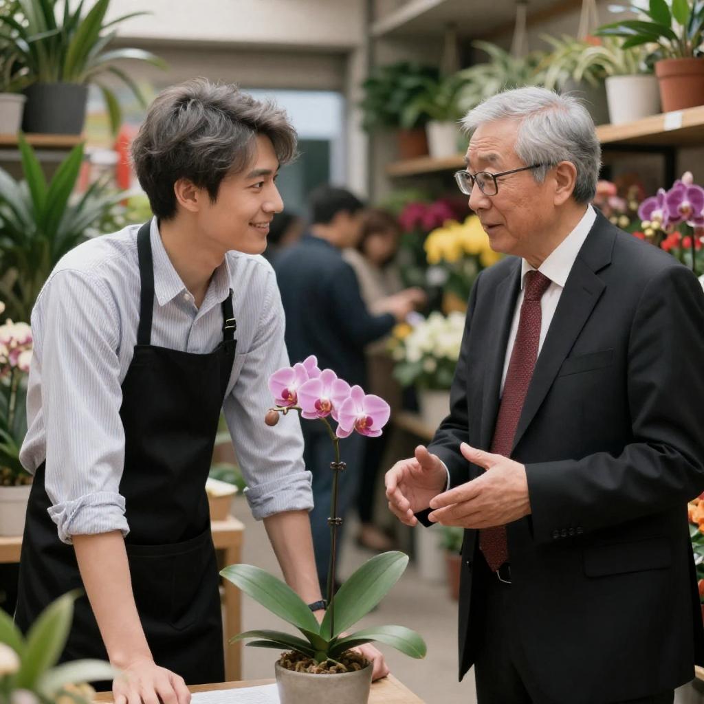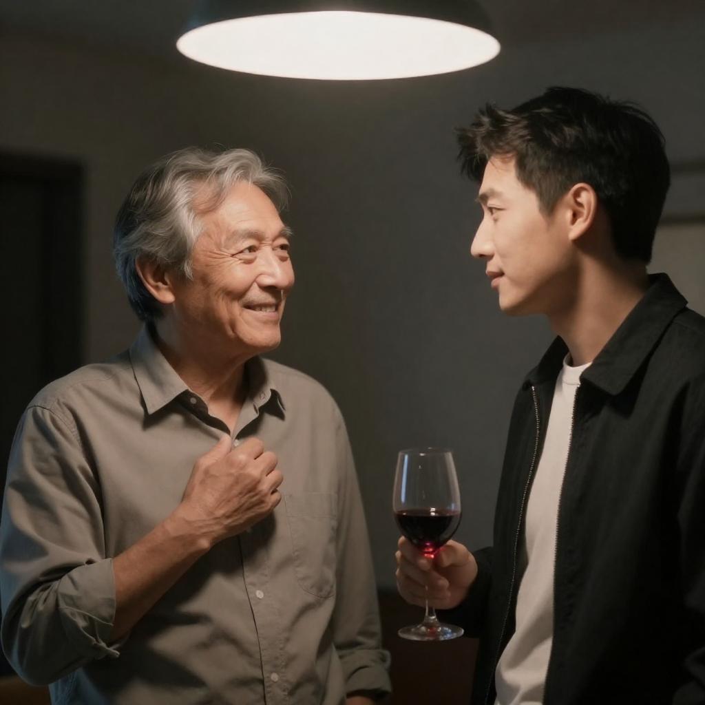Photograph of two men in a brightly lit indoor market. The older man with gray hair, glasses, and a black suit stands on the left, facing a younger man with short dark hair, wearing a gray shirt and black vest, on the right. They are engaged in conversation, with market stalls and lights in the background.