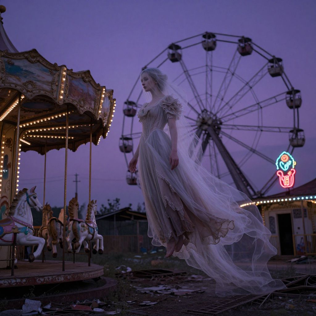 A mesmerizing digital artwork depicting an ethereal woman in a worn Victorian gown gracefully floating amidst the decaying structures of an abandoned amusement park during twilight. Her ghostly visage exudes solemnity as she navigates through rusted carousel horses and skeletal Ferris wheel frames, her translucent form illuminated against deep purple shades and glowing neon signs. This evocative scene masterfully blends the graceful serenity of Pre-Raphaelite art with the haunting allure of post-apocalyptic landscapes, inviting contemplation on themes of time and memory while enveloping viewers in a tapestry of melancholic beauty and introspection.