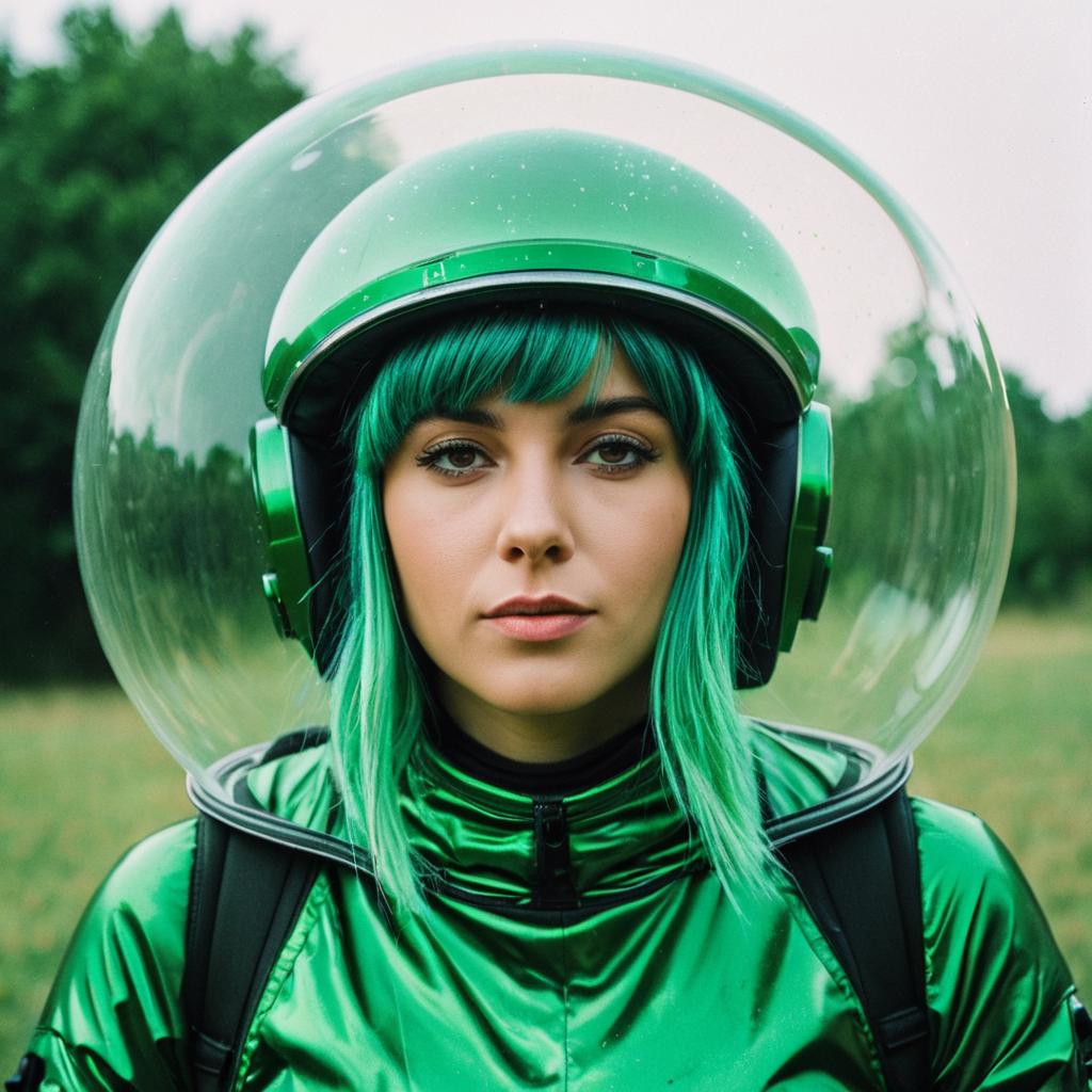 Green Bubble, woman in green costume with green hair and a bubble helmet