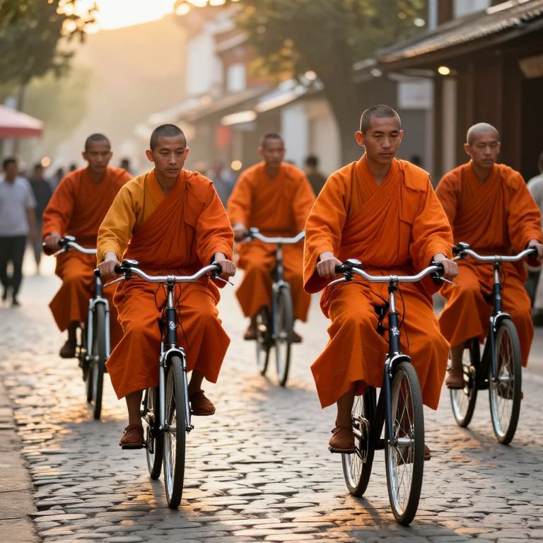 Monks clad in vibrant orange robes glide through a cobblestone street on bicycles, their synchronized movement evoking a serene and meditative ambiance under the golden-hour sunlight, blending realism with a touch of surreal harmony.