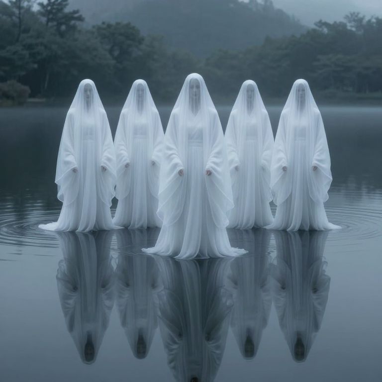 Ghosts cloaked in ethereal veils walk in solemn procession down a dimly lit urban street, flanked by glowing neon signs and suspended golden stars, as the wet pavement reflects their ghostly forms.