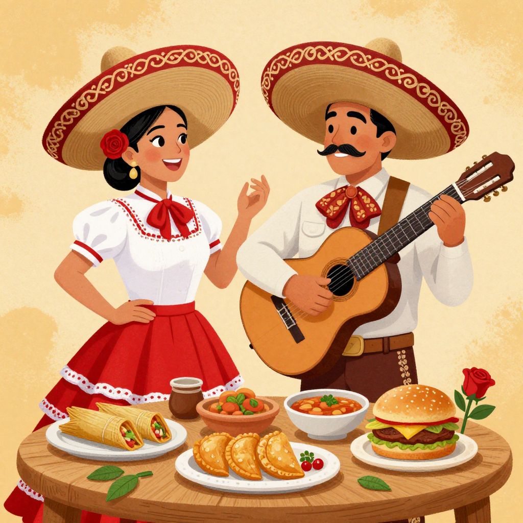 Traditional Mexican culture is vividly depicted through a vibrant illustration featuring a woman wearing a sombrero adorned with a red rose in her hair, dressed in a white blouse and red skirt, smiling warmly as she stands beside a man in a matching sombrero, sporting a mustache and playing a classic acoustic guitar. In front of them, a wooden table displays an array of colorful Mexican dishes, including tamales, empanadas, and a burger, alongside decorative elements such as green leaves and a small rose, all set against a warm, textured background evoking a festive atmosphere.