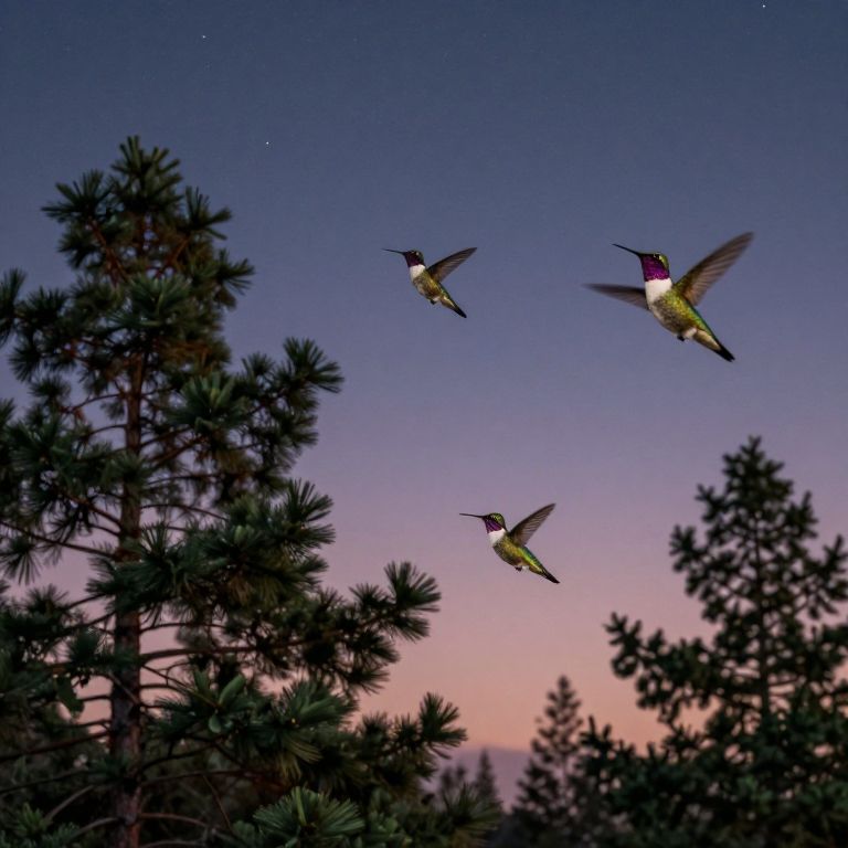 Under a starlit sky where celestial whispers blend with the rustling of ancient pines, hummingbirds dance through twilight, their iridescent wings catching the fading light—a fleeting symphony of freedom and wonder in the embrace of nature’s eternal rhythm.