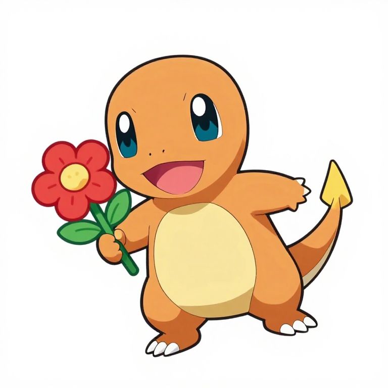 Dutch Angle cute charmander pokemon, holding a red bouqet of flowers, high quality, cartoon sticker,
