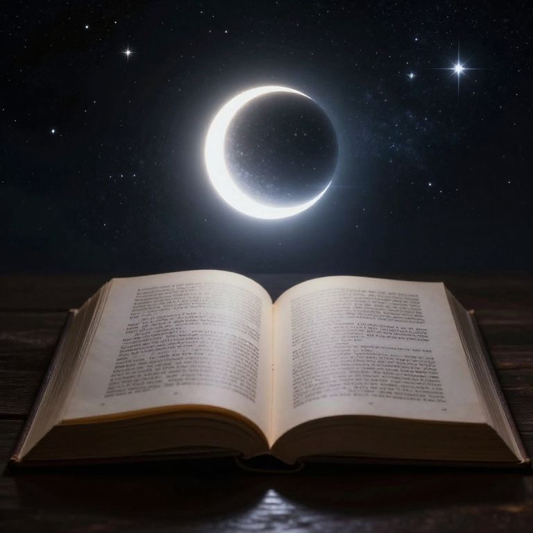 Photograph of an open book with illuminated text, beneath a glowing crescent moon and starry night sky.