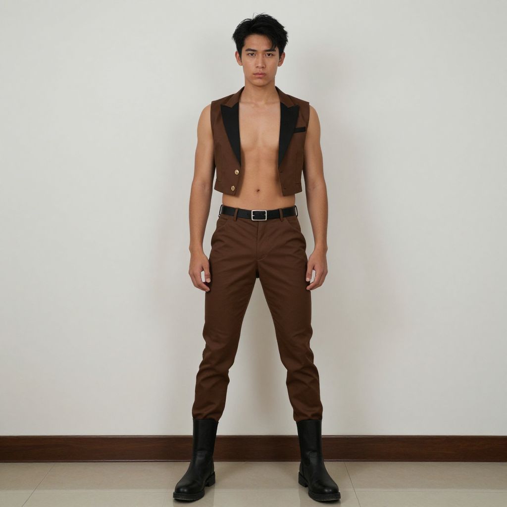 Photograph of a young Asian man standing against a plain white wall. He has short, slightly curly black hair and a lean, muscular build. He is shirtless, wearing brown vest with black trim, brown pants with a black belt, and black boots. His chest is smooth, and his expression is neutral. The floor is light-colored tile, and the bottom of the wall has a brown baseboard. The lighting is even, highlighting his skin tone, which is light brown. The overall style is minimalistic and modern.