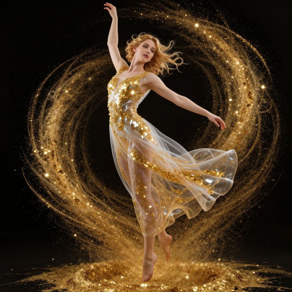 Photograph of a fair-skinned, blonde woman dancing gracefully against a black background. She wears a sheer, sleeveless dress adorned with gold sequins, which shimmer and reflect light. Her right arm is raised above her head, while her left arm extends outward, creating a dynamic pose. A swirling, golden, glittery trail surrounds her, adding a magical, ethereal effect. Her dress flows gently with her movement, and she stands barefoot on a golden, sparkling surface that matches the swirling trail. Her expression is serene and focused, embodying elegance and grace. The overall composition is vibrant and mesmerizing.