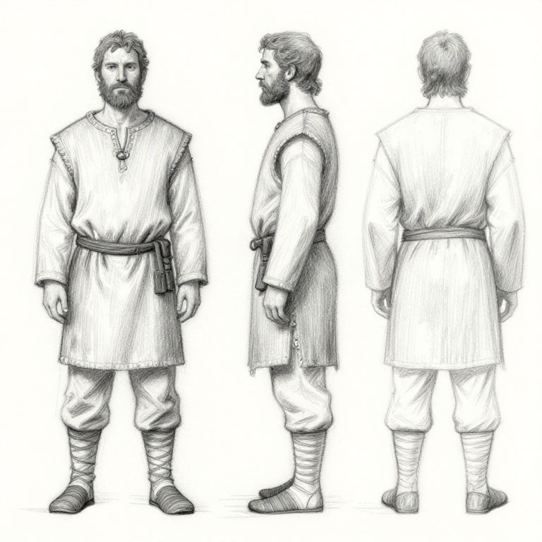 Male character turnaround sketch, hand-drawn pencil style, showing multiple angles including front, side, and back, dressed in medieval peasant clothing, rustic textures, rough shading, minimalist background with slight paper texture