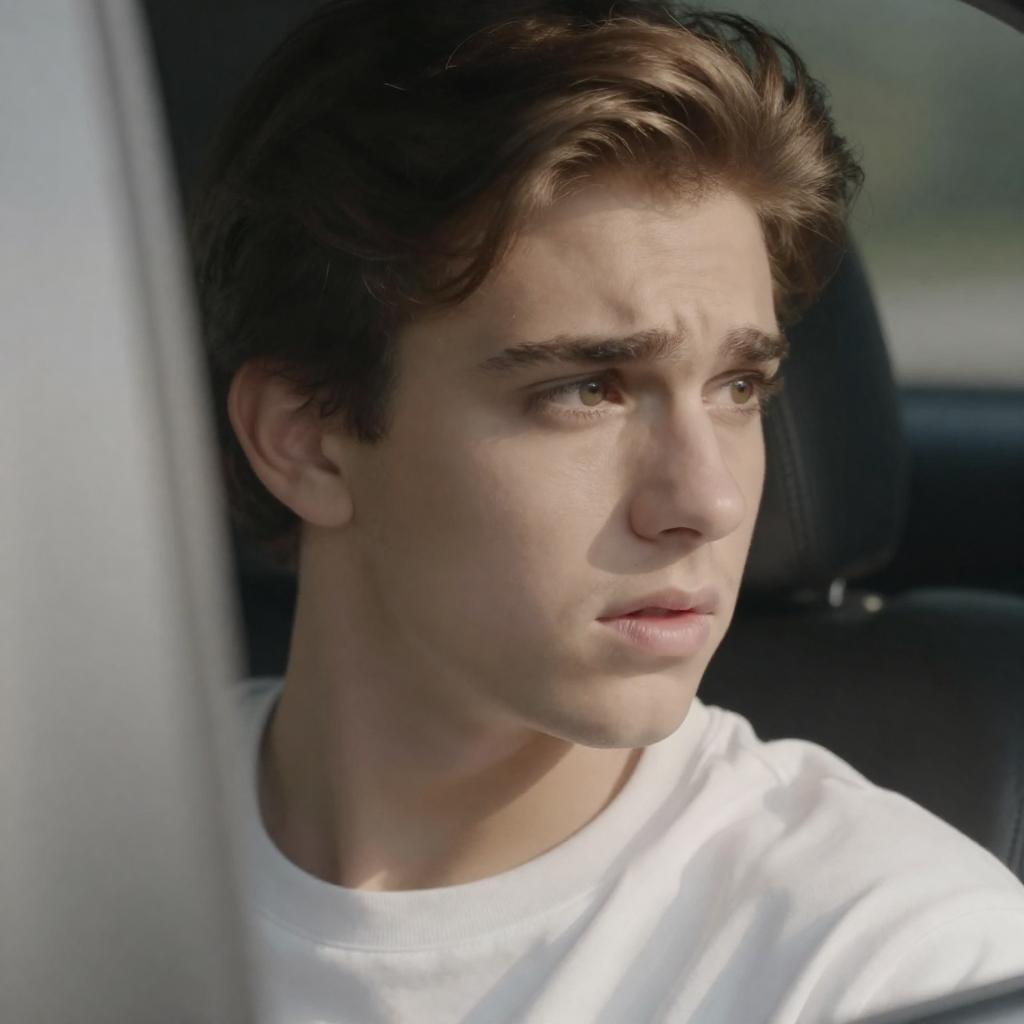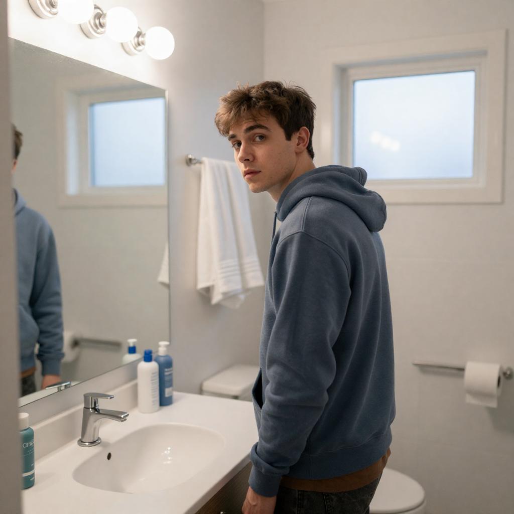 Young man with short brown hair, blue hoodie over brown shirt, stands in white bathroom, looking over shoulder. Bathroom has white sink, mirror, countertop with toiletries, toilet paper roll, and hanging towels. Two frosted windows in background. Reflections in mirror.