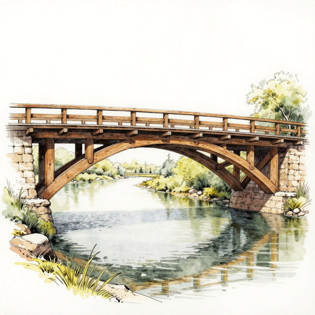 Stable drawing of a classic wooden bridge arching over a calm river, rendered in fine ink and watercolor style, showcasing sturdy construction with realistic wood grain and rippling water reflections, conveying balance and permanence.