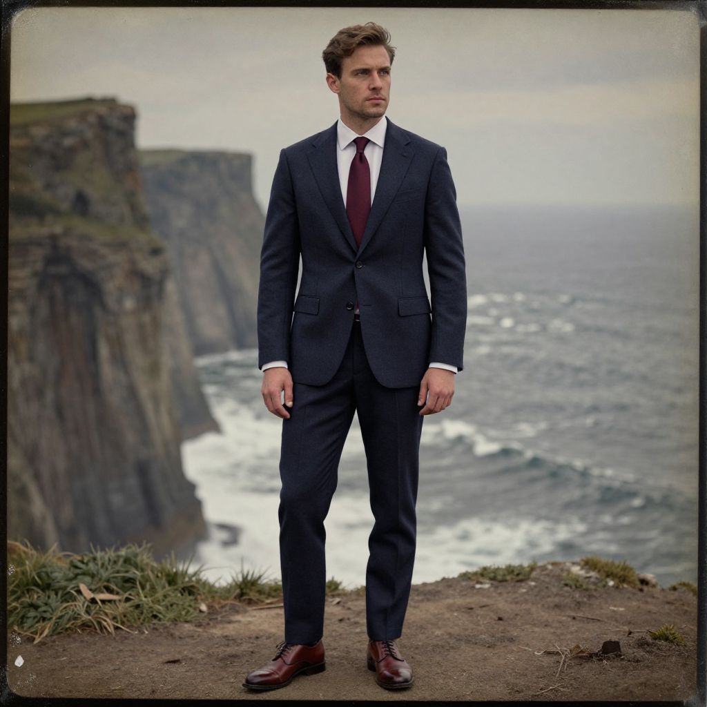 A man, navy wool suit, slim-fit tailored jacket, tapered trousers, crisp white cotton shirt, silk tie in deep burgundy, polished leather oxford shoes, standing on dramatic cliffs, collodion wet plate style, contemplative expression, ocean waves crashing below. Man has masculine face and piercing eyes