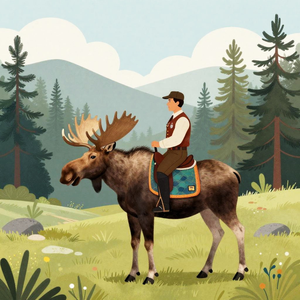 Whimsical illustration of a Canadian riding moose with colorful saddle, park ranger in leather attire riding, peaceful forest background, soft pastel tones, stylized nature art