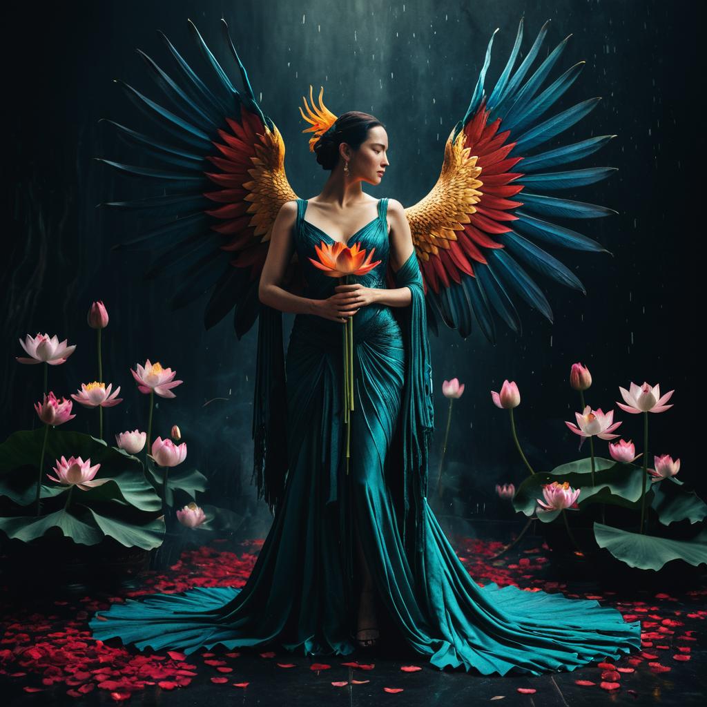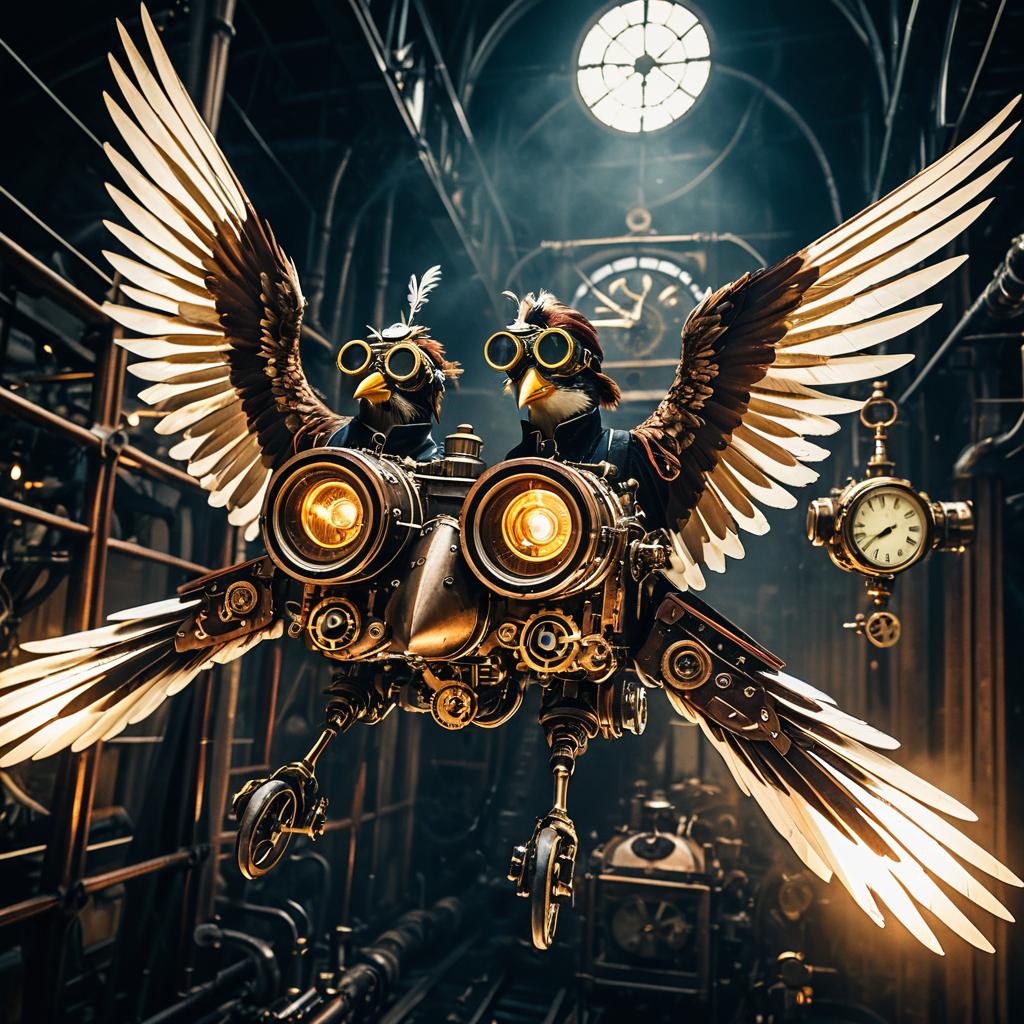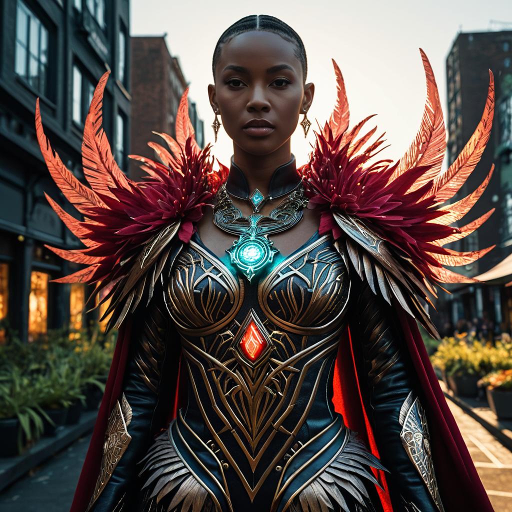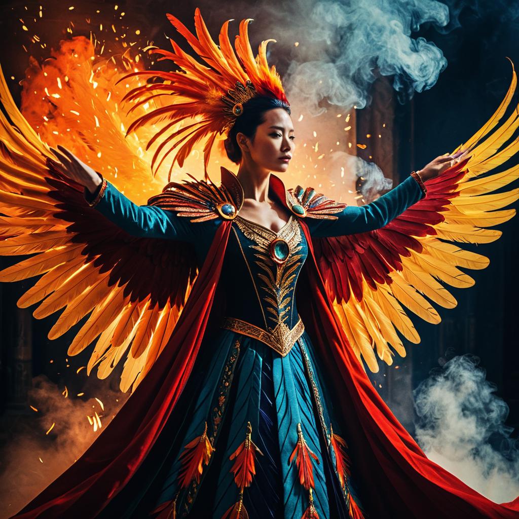 Steam Power 2 phoenixes, wears a fiery feather cape, rising majestically, surreal, vibrant colors, with radiant fiery glow