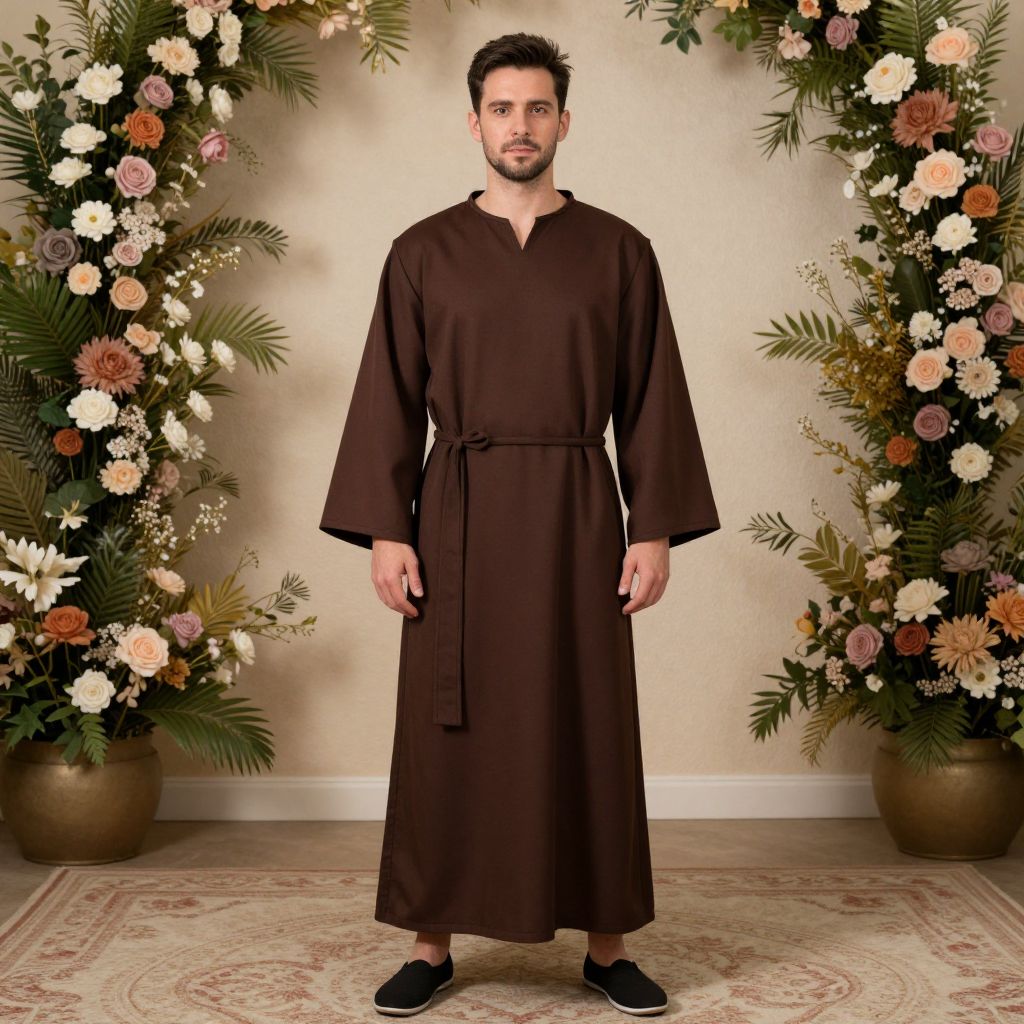 Toga Themed Costume, man in a brown robe standing in front of a floral backdrop