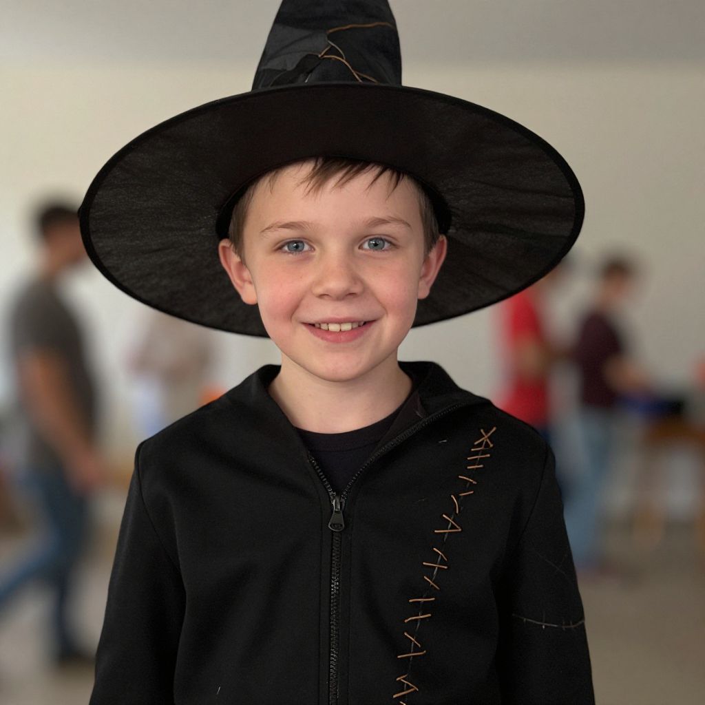 Funny man costume halloween, hat, solo, witch hat, 1boy, male focus, jacket, looking at viewer, blurry background, black headwear, black jacket, blurry, upper body, stitches, halloween