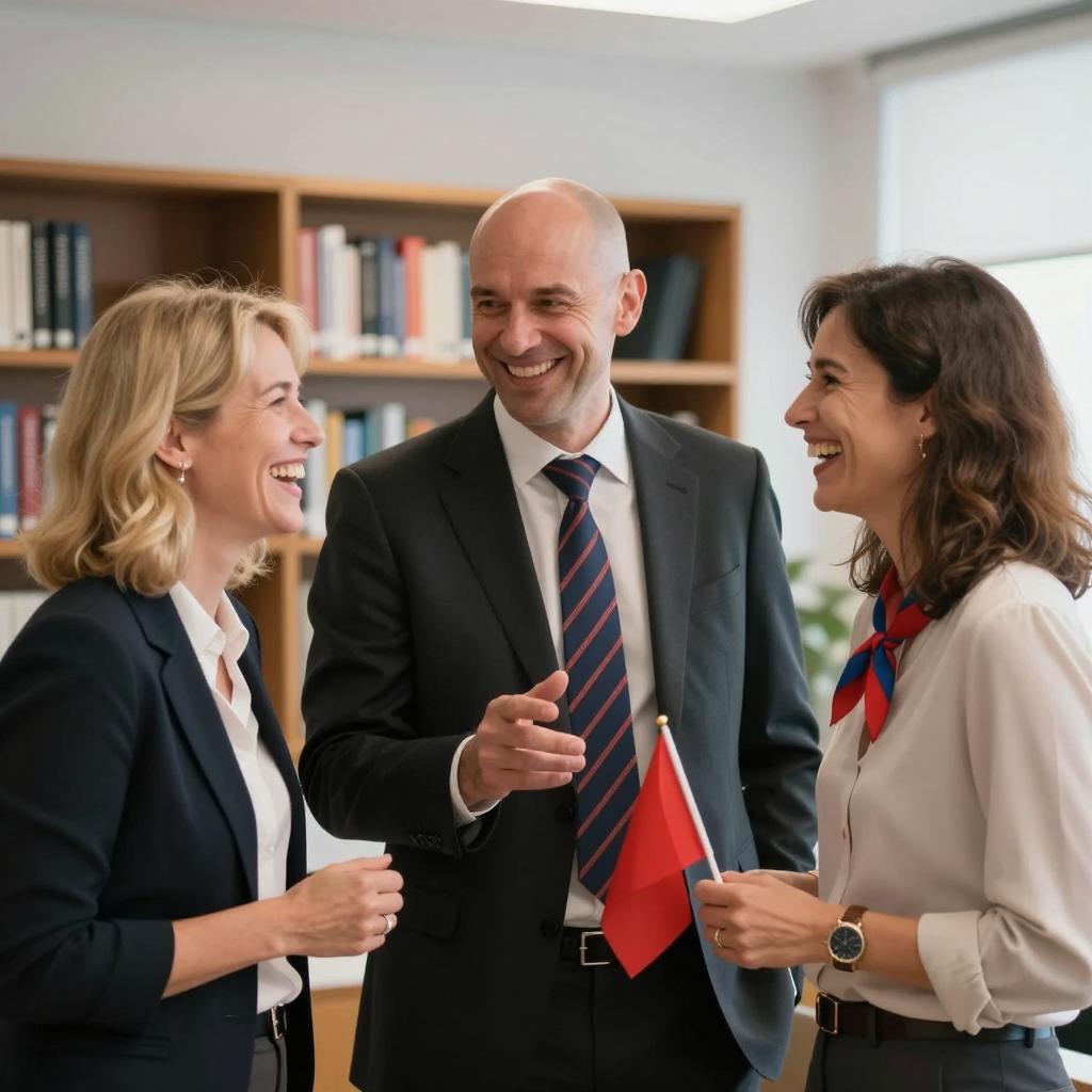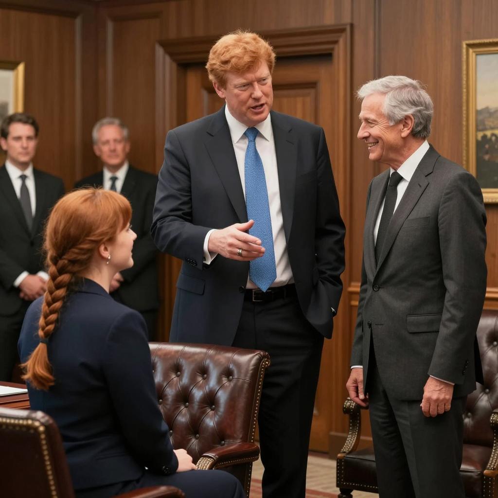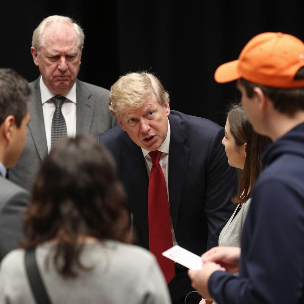 Photograph of a crowded scene. Central figure, blond man in dark suit with red tie, leans forward, speaking to woman with dark hair in gray cardigan. Man on left in gray suit and black tie stands behind him. Several people, including man in orange cap, hold objects and cards, facing the central figures. Dark background.