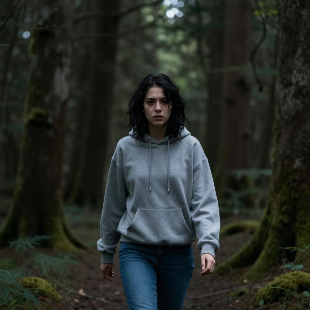 Concerned Woman in a Forest Setting