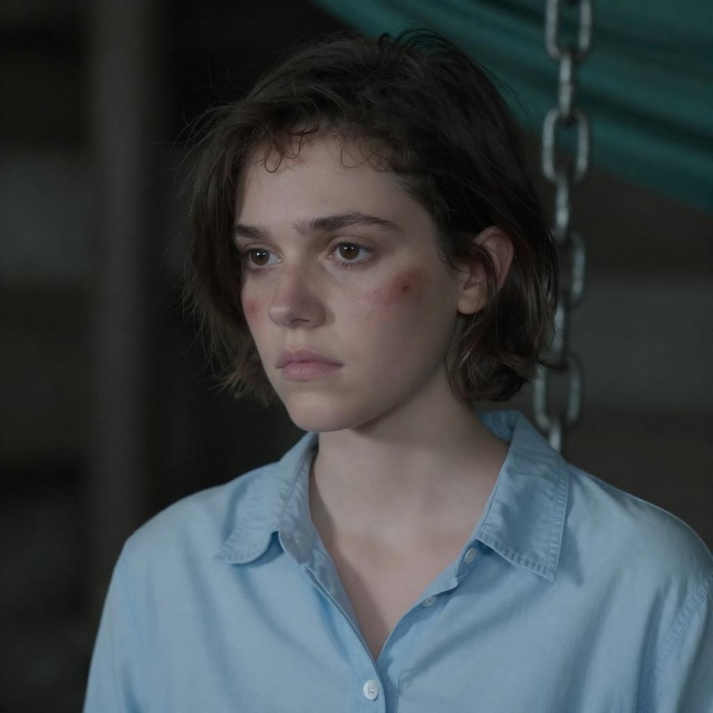 Young woman with short, curly dark hair, wearing a gray long-sleeve shirt and black vest, leaning against a tree. She has a red bruise on her right cheek. Forest background with tall, blurred trees. She looks to the right with a concerned expression.
