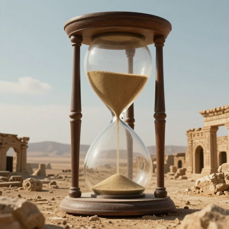 A colossal hourglass stands defiantly in a desolate landscape, its sands flowing backward as ancient ruins rise from its base, defying the passage of time and reshaping history into a living, breathing tapestry of forgotten worlds.
