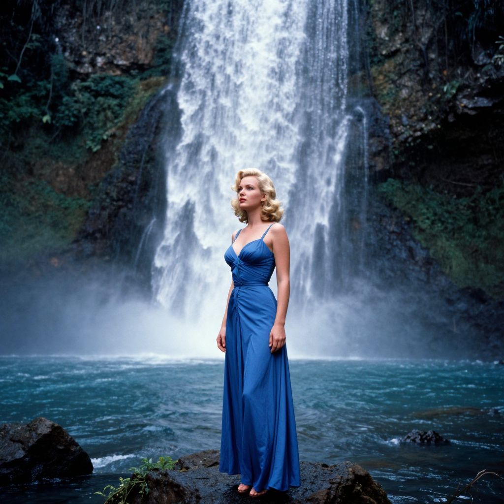 A tall woman in a vintage-inspired red A-line dress with a fitted bodice and flared skirt stands by a mountain lake with a waterfall, wearing a gray beret. She is playfully tossing pebbles into the water, captured in the soft, nostalgic tones of 3M analog film stock. Sexy. Pretty face and beаutiful eyes. Big breasts