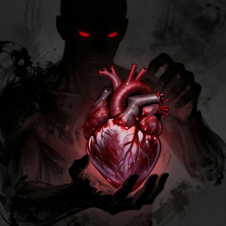 A digital illustration features a shadowy, humanoid figure with glowing red eyes holding a vividly detailed, glowing red and pink heart. The heart has realistic veins and arteries, with a metallic texture on the aorta and pulmonary arteries. The background is dark and abstract, with smoky, black brushstrokes. The figure's hands, also shadowy, frame the heart, emphasizing its illuminated center. The overall mood is eerie and mysterious, with a strong contrast between the dark figure and the bright heart. The style is reminiscent of dark fantasy or horror art.