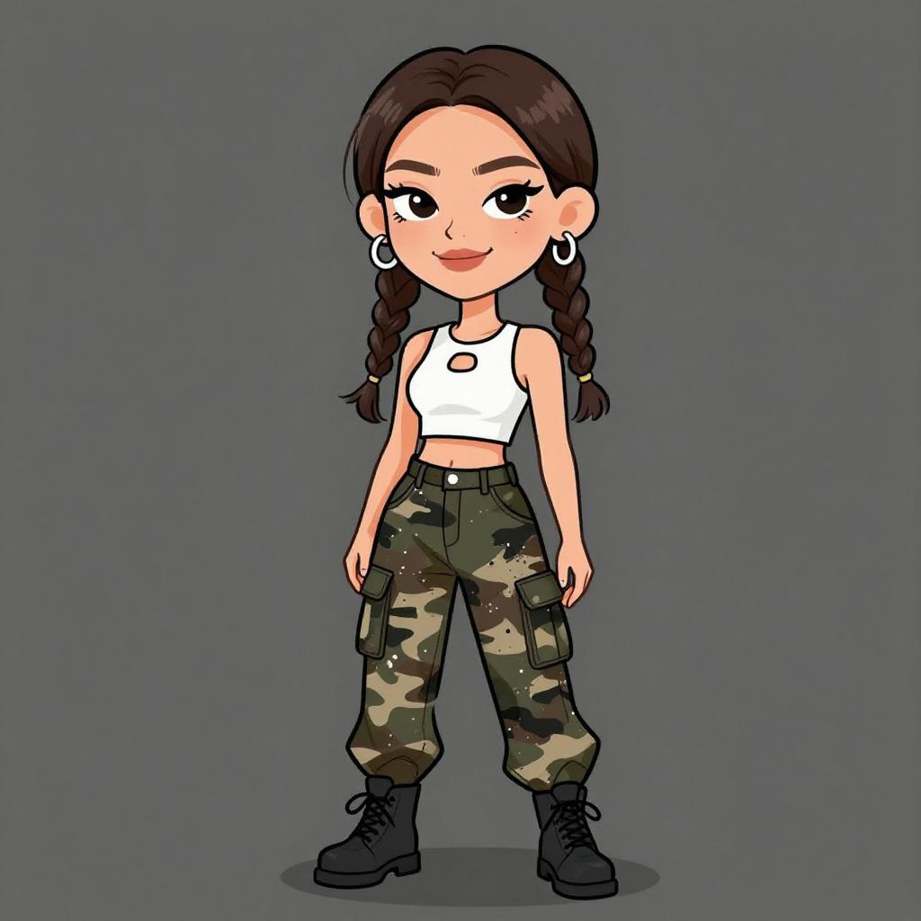 Woman with pretty face and pretty hair. smiling Woman, streetwear, white cropped tank top with a keyhole cutout at the neckline, high-waisted camouflage cargo pants with paint splatter detail, black lace-up boots, small hoop earrings, two braids, photo studio background --sref 1467
