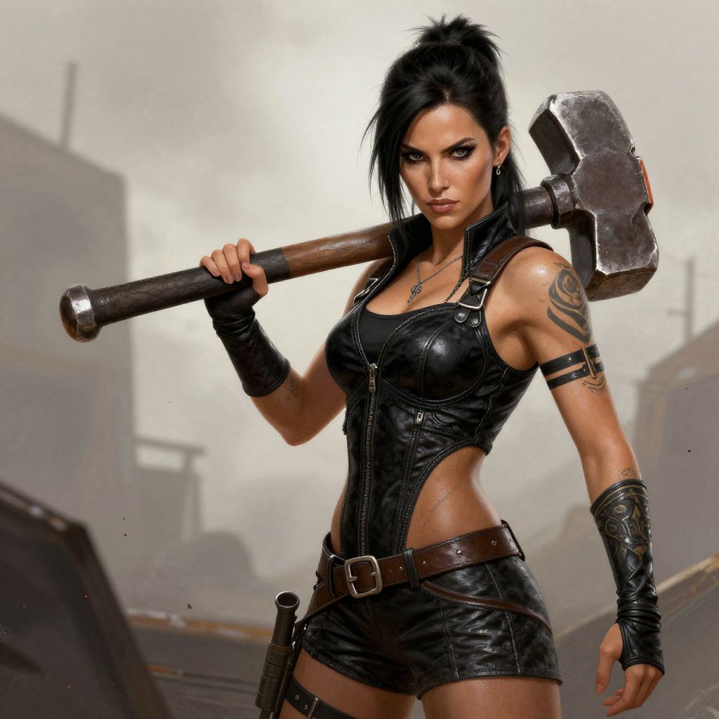 Digital artwork of a tough, black-haired woman with tattoos, wearing black leather outfit and holding a large hammer over her shoulder.