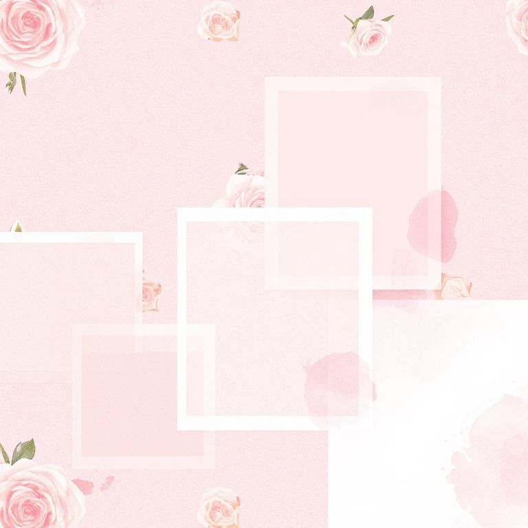 Digital floral pattern with pink roses, green leaves, and subtle pink accents, arranged in the top left and right corners.