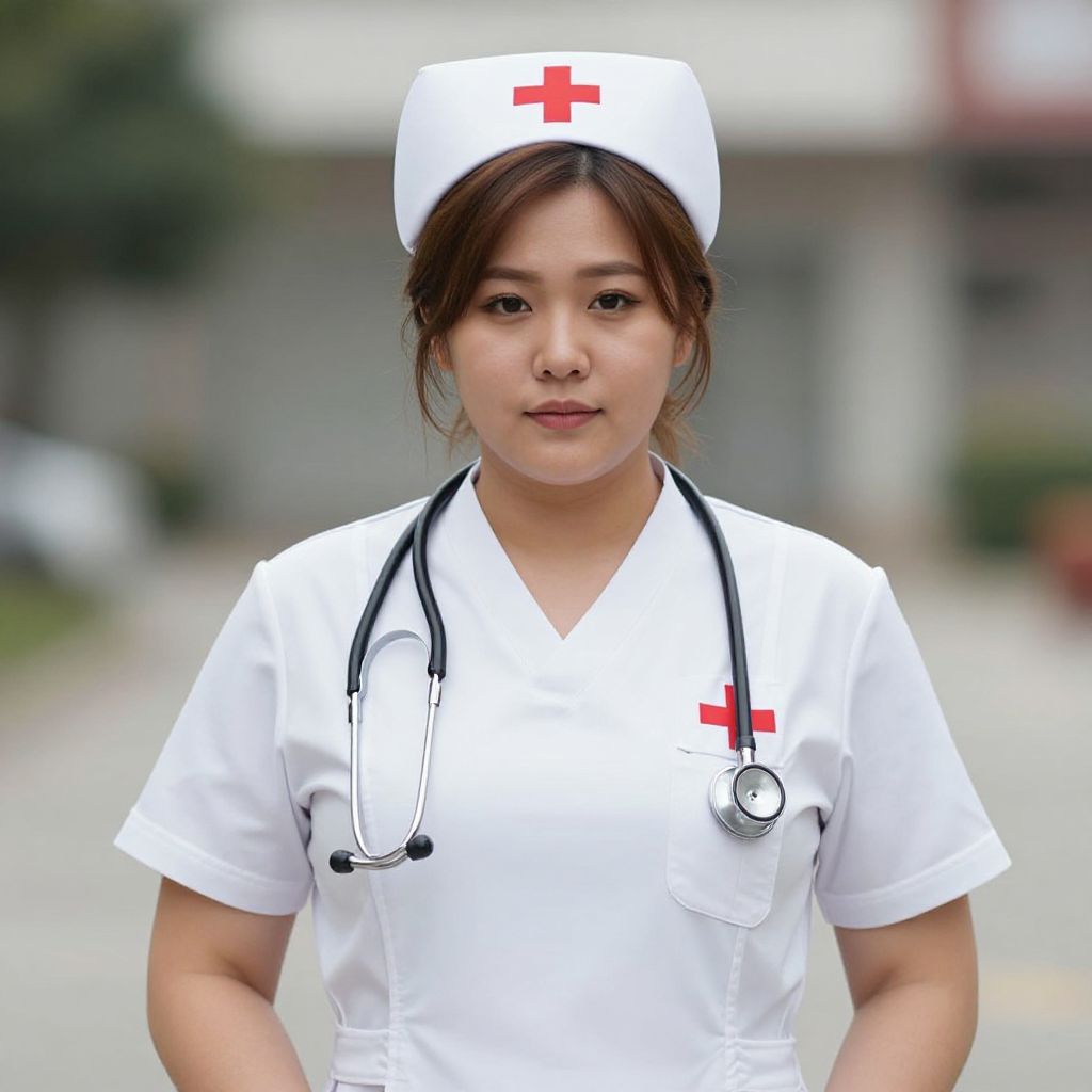 "plus size pulse nurse, nurse, 1girl, nurse cap, hat, solo, blurry background, stethoscope, blurry, outdoors, realistic, photorealistic, brown hair, red cross, short sleeves, standing, asian, closed mouth, cowboy shot Realistic photo of casual sexy person with pretty face"