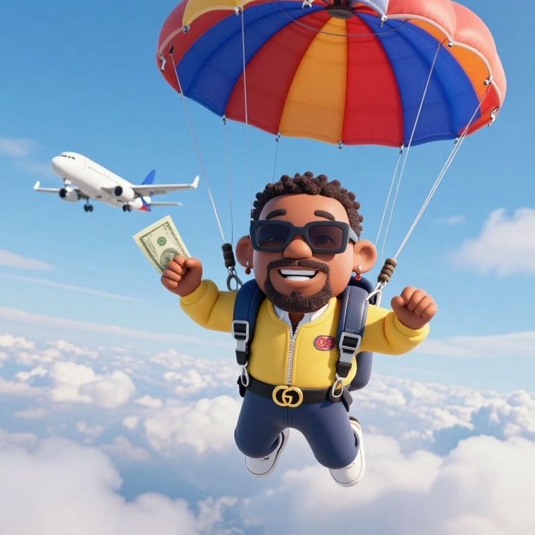 A vibrant CGI image depicts a cartoonish, dark-skinned man with a curly beard and black sunglasses, paragliding above fluffy white clouds. He wears a yellow jacket with a red and blue emblem, black pants, and white shoes, and holds a dollar bill in his raised right hand. He has a joyful expression and is attached to a colorful, red, orange, and blue paraglider. In the bright blue sky, a white airplane flies in the background. The man's paraglider is suspended by white lines, adding a sense of motion and adventure to the scene.