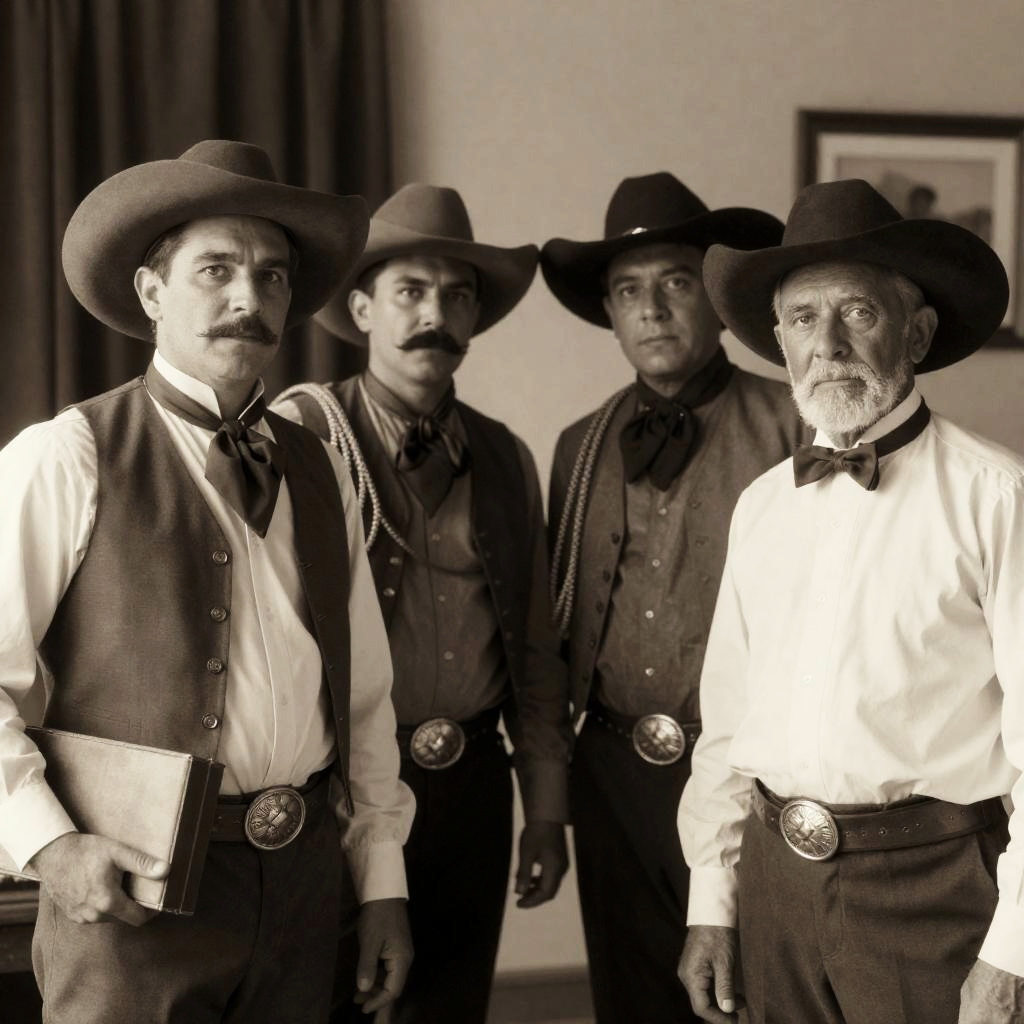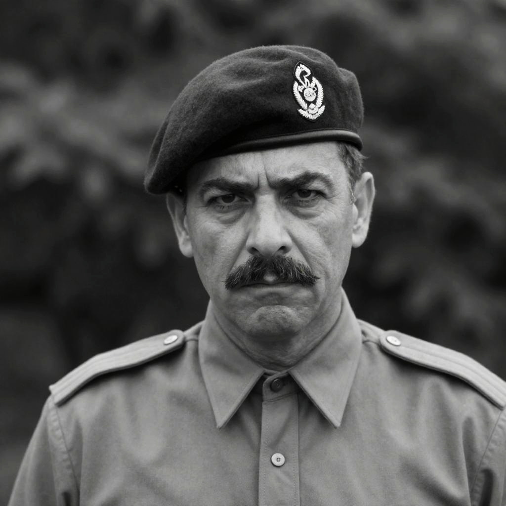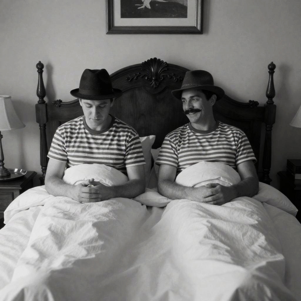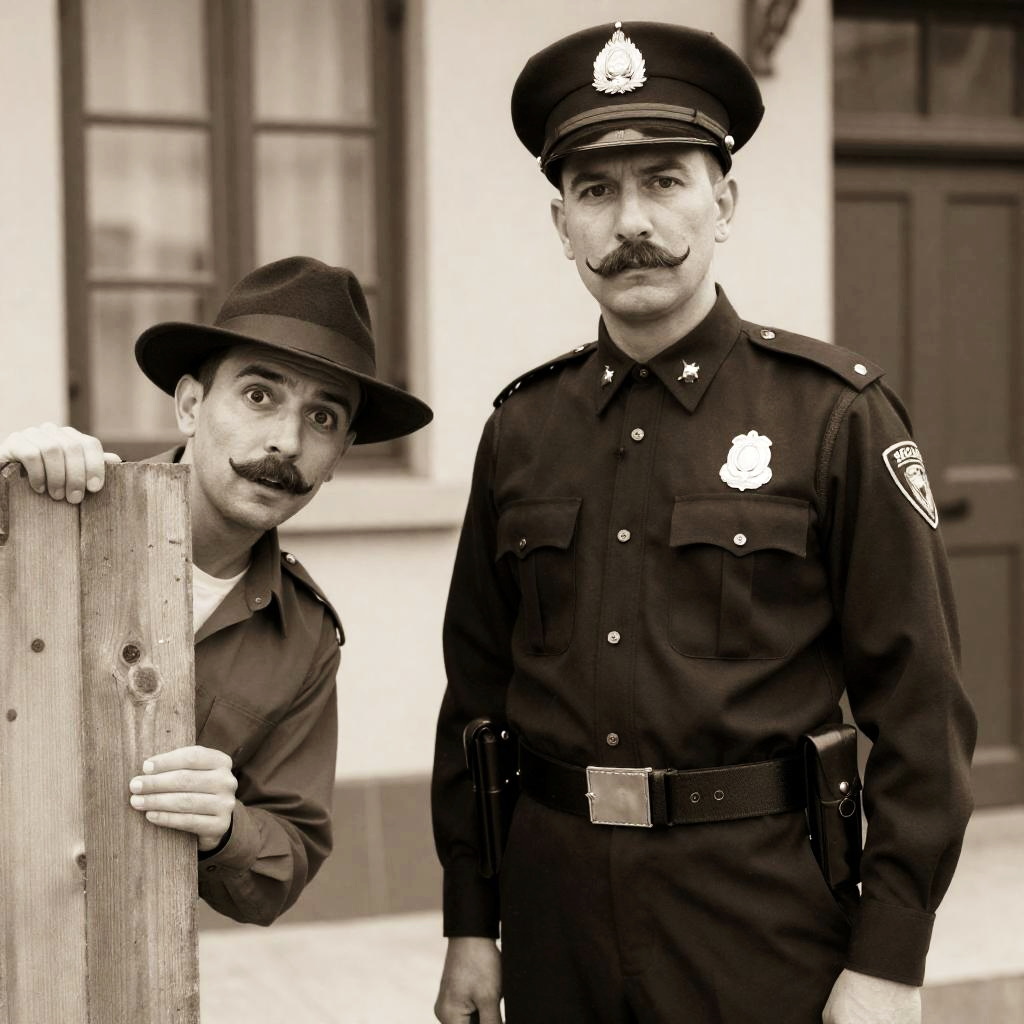 Sepia photograph of two men. First man, standing, wears dark police uniform with cap, mustache, serious expression. Second man, peering from behind wooden plank, wears dark hat, mustache, surprised expression. Background: aged building with window and door.